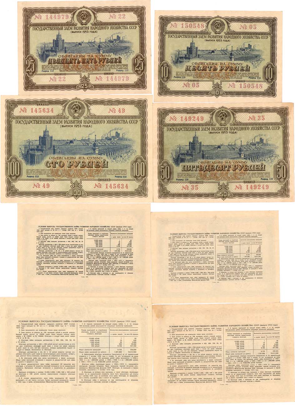 Облигация на сумму 10 рублей 1953 года. Серия №150548, №05, разряд 119. aUNC Облигация на сумму 25 рублей 1953 года. Серия №144979, №22, разряд 112. aUNC. Облигация на сумму 50 рублей 1953 года. Серия №149249, №35, разряд 116. aUNC. Облигация на сумму 100 рублей 1953 года. Серия №145634, №49, разряд 018. aUNC. aUNC.