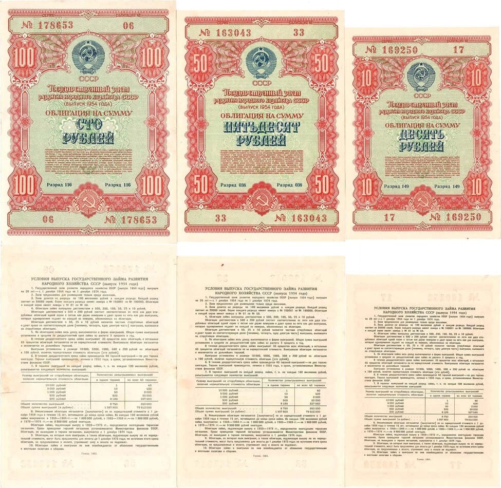 Облигация на сумму 10 рублей 1954 года. Серия №169250, №17, разряд 149. aUNC. Облигация на сумму 50 рублей 1954 года. Серия №163043, №33, разряд 038. aUNC. Облигация на сумму 100 рублей 1954 года. Серия №178653, №06, разряд 116. aUNC. aUNC.