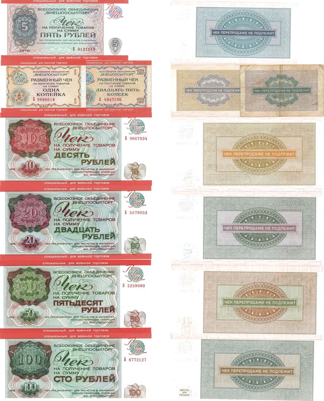 Чеки (разменные чеки) Всесоюзного объединения "Внешпосылторг" выпуск 1976 года с грифом "СПЕЦИАЛЬНЫЙ ДЛЯ ВОЕННОЙ ТОРГОВЛИ". Выпуск для военнослужащих Ограниченного контингента советских войск в Афганистане.