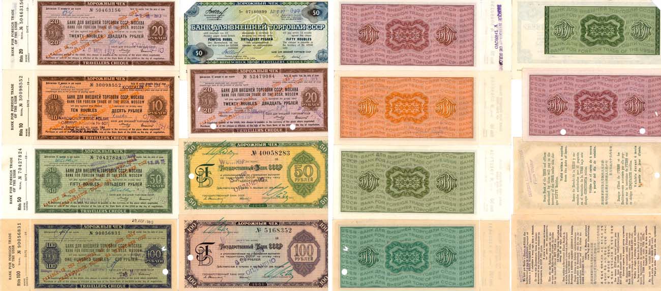 Чек на 10 рублей. Погашен в Польше. Оплачен 30 июля 1973 года. С корешком. UNC. Чек на 20 рублей. Оплачен 20 июля 1973 года. С корешком. UNC. Чек на 20 рублей. Погашен в Польше (Лодзь). Оплачен 29 августа 1976 года. Без корешка. Просечки. AU. Чек на 50 рублей. ГДР-Индустриальный банк. Оплачен 5 июля 1973 года. С корешком. UNC. Чек на 100 рублей. Болгария-София. Оплачен 18 мая 1980 года. С корешком. UNC. Чек на 50 рублей. Банк Внешней торговли СССР. Выдан 20 июня 1989 года Москва. AU. Чек на 50 рублей. Выдан ГДР-WEIMAR 24 марта 1969 года. Оплачен 13 апреля 1969 года. Просечка. AU. Чек на 100 рублей. Выдан ГДР-WEIMAR 24 марта 1969 года. Оплачен 13 апреля 1969 года. Просечка. AU. aUNC/UNC.