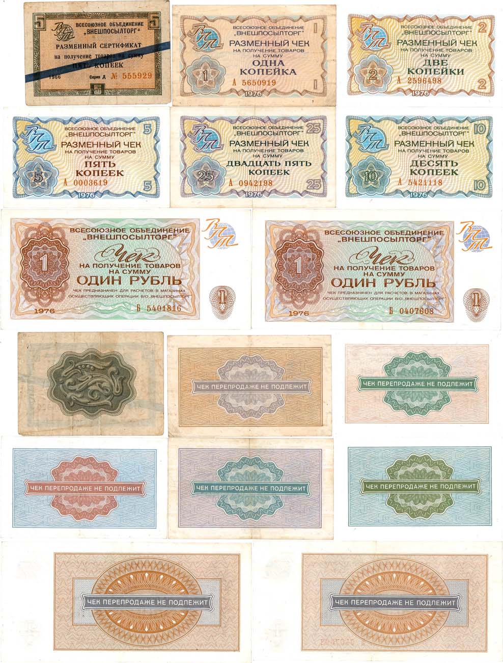 Всесоюзное объединение "ВНЕШПОСЫЛТОРГ". Разменный чек. 1 копейка 1976 года. XF. Всесоюзное объединение "ВНЕШПОСЫЛТОРГ". Разменный чек. 2 копейки 1976 года. AU. Всесоюзное объединение "ВНЕШПОСЫЛТОРГ". Разменный чек. 5 копеек 1976 года. XF. Всесоюзное объединение "ВНЕШПОСЫЛТОРГ". Разменный чек. 10 копеек 1976 года. AU. Всесоюзное объединение "ВНЕШПОСЫЛТОРГ". Разменный чек. 25 копеек 1976 года. XF. Всесоюзное объединение "ВНЕШПОСЫЛТОРГ". Разменный чек. 1 рубль 1976 года. XF. Всесоюзное объединение "ВНЕШПОСЫЛТОРГ". Разменный чек. 1 рубль 1976 года. XF. Всесоюзное объединение "ВНЕШПОСЫЛТОРГ". Разменный сертификат. 5 копеек 1966 года. Серия Д. VF. VF/AU.