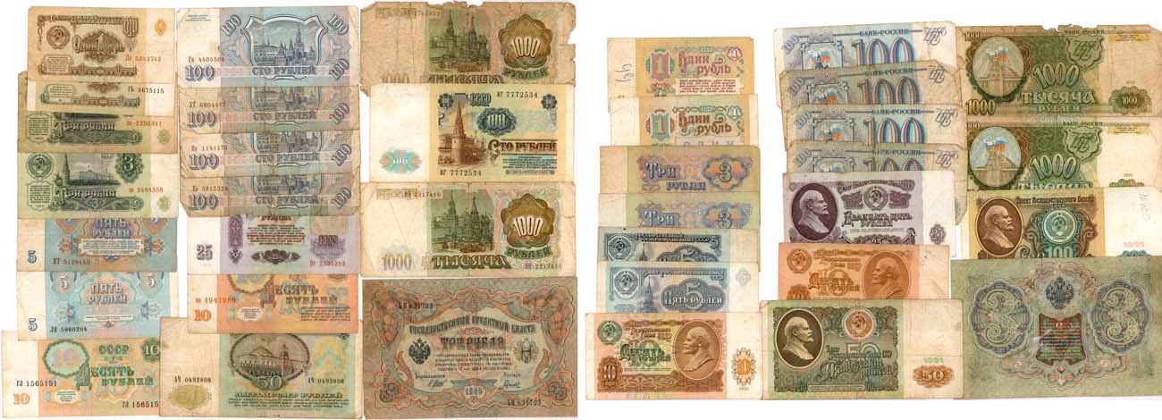 3 рубля 1905 года. Серия БН 831723. Подписи: Шипов/Гаврилов. XF. 1 рубль 1961 года. Серия Ло 5343742. VF-. 3 рубля 1961 года. Серия ох 2256311. F+. 3 рубля 1961 года. Серия ээ 3484556. VF. 5 рублей 1961 года. Серия КТ 5128445. VF. 10 рублей 1961 года. Серия бп 4947989. VF+. 25 рублей 1961 года. Серия Кт 2395252. Без свечения в ультрафиолете. VF. 1 рубль 1991 года. Серия ГЬ 3675115. VF. 5 рублей 1991 года. Серия ЛВ 5860204. VF. 10 рублей 1991 года. Серия ГЛ 1565151. VF. 50 рублей 1991 года. Серия АЧ 0492808. VF-. 100 рублей 1991 года. Серия ИГ 7772534. XF. 100 рублей 1993 года. Серия Гя 4404504. F. 100 рублей 1993 года. Серия Ие 1141176. G. 100 рублей 1993 года. Серия ХТ 6804447. G. 100 рублей 1993 года. Серия Еэ 3815324. G. 1000 рублей 1993 года. Серия АЕ 1742859. G. 1000 рублей 1993 года. Серия ИЯ 2217410. F. G/XF.