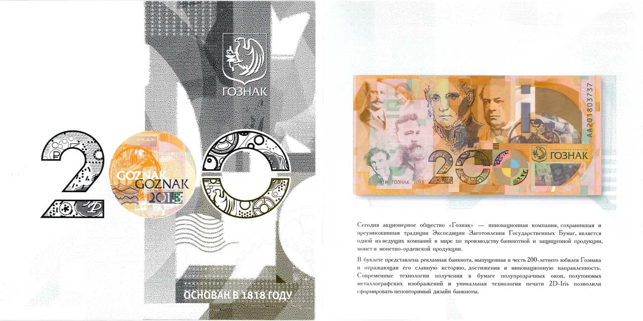 В память 200-летия основания Экспедиции заготовления государственных бумаг (позднее - "Гознак"). Изображены портреты выдающихся деятелей организации, а также исторический процесс печати денежных знаков.