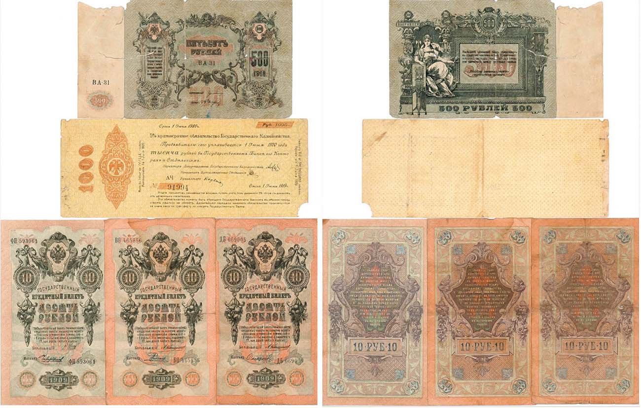 Государственный кредитный билет. 10 рублей 1909 года. Серия ФП 593061. Советский выпуск (1917-1921 гг.). Управляющий Шипов, Кассир Чихирджин. ZG2№ 1.17.21. VF/XF. Государственный кредитный билет. 10 рублей 1909 года. Серия ДБ 069005. Управляющий Коншин, Кассир Государственный кредитный билет. 10 рублей 1909 года. Серия ВО 465856. Управляющий Коншин, Кассир Е. Родионов. ZG2№ 1.16.80. VF/XF. Ростов. Денежный знак. 500 рублей 1918 года. Серия ВА-31. В/З вензель ГБ. Тайный ключ. Лазарев Л48. G/F. Омск. 5% обязательство Государственного казначейства. 1000 рублей 1919 года. Выпуск 1 июня 1919 года. Серия АЧ №91994. Кардаков K11.3.36. VF/XF. G/XF.