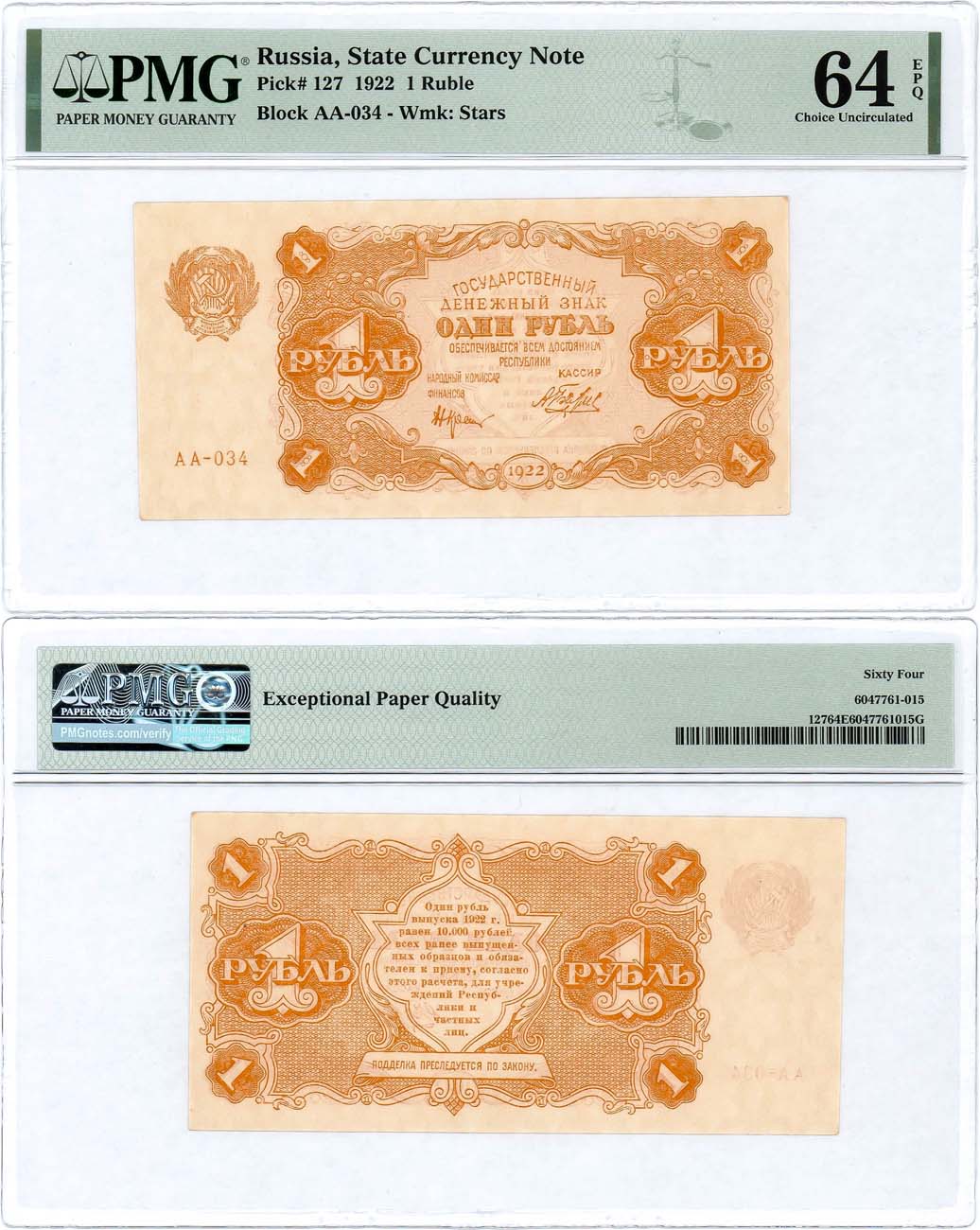 Серия АА-034. Водяной знак звёзды. Нарком финансов Крестинский, кассир Беляев. ZG2№2.7.1. Pick 127. 64 EPQ Choice Uncirculated.