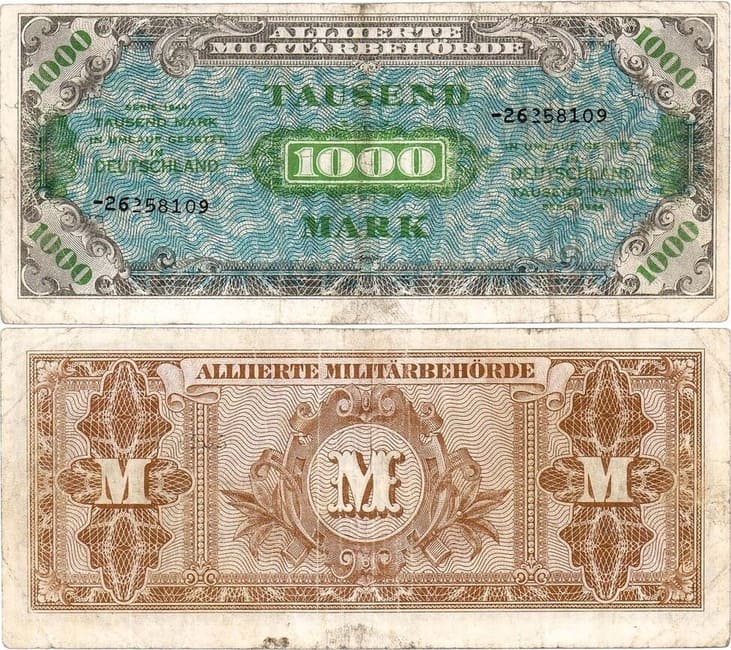 №-26258109. Оккупационная эмиссия союзников в Германии. Германия в 1945—1949 годах — представляла собой область в центре Европы, разделённую на четыре зоны оккупации, с разрушенной экономикой и инфраструктурой, не имеющей собственной администрации. С самого дня окончания войны она оказалась разделённой на две области, контролируемые двумя принципиально различными политэкономическими системами: Три западные зоны оккупации под управлением Англии, Франции и Соединённых Штатов Америки и Восточная зона оккупации под управлением советской администрации. Для советской зоны установлены номера начинающиеся с "-", для американской с "1", английской с "0", французской с "00". Pick 198b. Кардаков XIV.5.8 (20 дойчмарок). Самый крупный номинал. Исключительно редкие. VF.