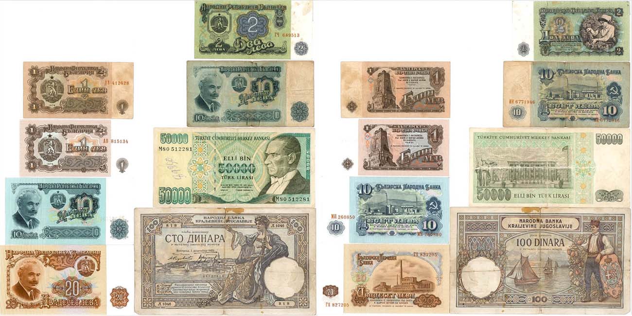 Югославия. 100 динаров 1929 года. Белград. 1 декабря 1929 года. Pick 27b. VF. Турция. 50000 лир 1970 года. Кемаль Ататюрк. Pick 204. VF. Болгария. 1 лев 1974 года. Pick 93a. F/VF. Болгария. 1 лев 1974 года. Pick 93a. UNC. Болгария. 2 лева 1974 года. Pick 94a. VF/XF. Болгария. 10 лева 1974 года. Pick 96b. F. Болгария. 10 лева 1974 года. Pick 96a. XF. Болгария. 20 лева 1974 года. Pick 97a. AU. F/UNC.
