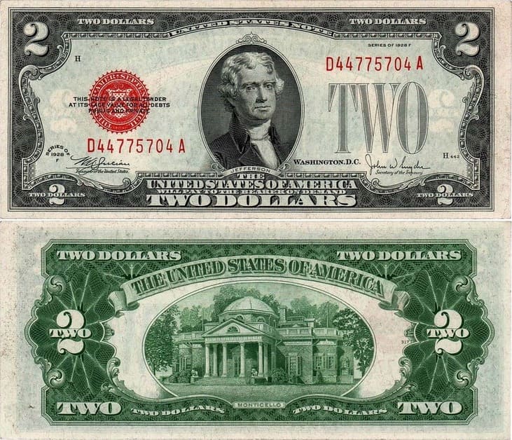 № D 44775704 A. Президент Джефферсон. Размер 156 x 66 мм. Красная печать. Подписи: Подписи: Юлиан/Снайдер. Wor P-378f. UNC-.