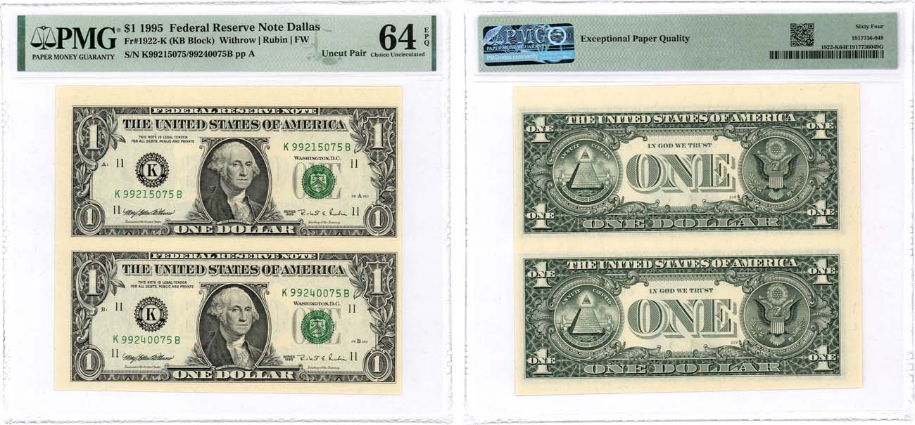 Серии: K99215075/99240075B pp A. Fr.1922-K (KB Block). Подписи: Withrow/Rubin/FW. (Техас, Даллас). 64 EPQ Choice Uncirculated.