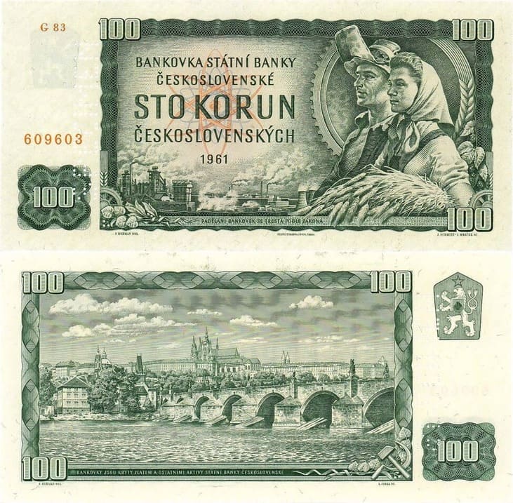 Серия G 83, №609603. Государственный банк Чехословакии. Перфорация SPECIMEN. "Карлов мост" в Праге. Pick 91s. UNC-.