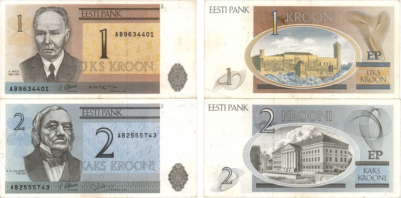 Эстония. 1 крона 1992 года. Крепость Таллина. Pick 69a. XF. Эстония. 2 кроны 1992 года. Университет Тарту. Pick 70a. XF. XF.