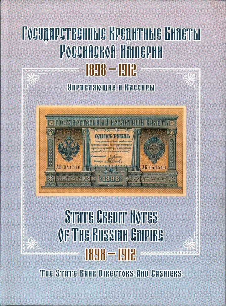 СПБ, 2007 г. Издание содержит образцы подписей управляющих государственного банка и кассиров на государственных кредитных билетах Российской империи образцов 1898–1912 гг. Данные систематизированы по подписям управляющих и кассиров. Огромное по полноте знаний исследование, первая попытка подобной систематизации.
