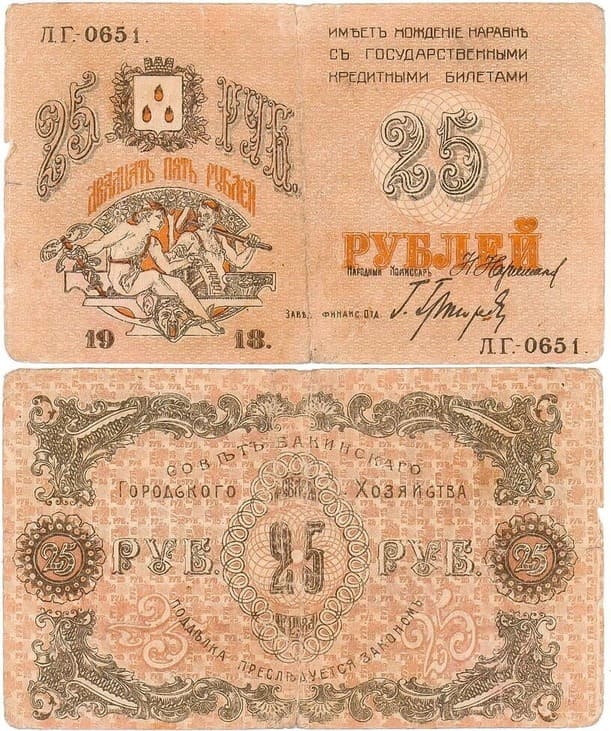 Серия ЛГ-0651. Подписи: народный комиссар - Н. Нариманов, заведующий финансовым отделом - Г. Григорян. AZR-2.2.1. Кардаков VIII.10.18. F/VF.