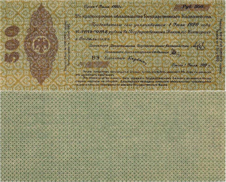 Временное Российское Правительство. Верховный правитель - адмирал А.В. Колчак. 5% Краткосрочное Обязательство Государственного Казначейства 500 рублей 1919 года (1 июля 1919 года).