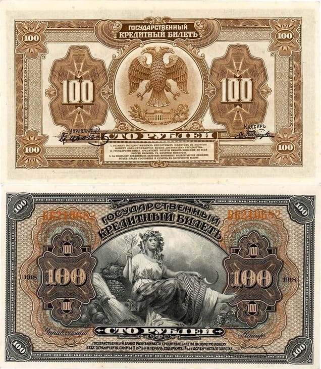 Государственные кредитные билеты образца 1918 года. Выпуск 1920 года (деньги американского изготовления) подписывались: Управляющий М. Иванов, Кассир И. Ковнацкий.