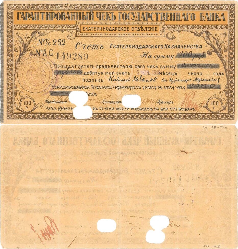 №Т/С 252, №АС 149289. Выдан 07 ноября 1918 года. Штамп: малый орел без корон. Счет Екатринодарского Казначейства. Погашен сквозными отверстиями. Чек действителен в течение 6 месяцев после выдачи. Круглая синяя печатьЮ рукописные подписи. Рябченко №6162г. VF/VF+.