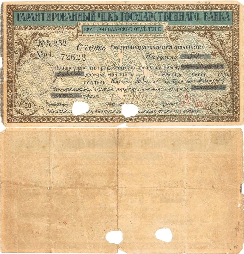 №Т/С 252, №АС 72622. Штамп: малый орел с коронами. Счет Екатринодарского Казначейства. Погашен сквозными отверстиями. Выпуск 1 ноября 1918 года. Рябченко №6161и. VF/VF+.