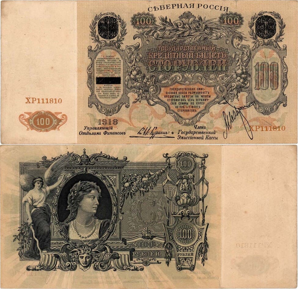Серия ХР №111810. Банкноты отпечатаны в Англии. В обращение поступили только с января 1919 года, так как на месте в Архангельске пришлось заштемпелевывать все императорские атрибуты и добавлять забытые подписи Управляющего Отделом Финансов князя Ив. Куракина и Члена Государственной Эмиссионной Кассы. В декабре 1919 года началось их изъятие по гарантированному курсу, которое завершилось 1 февраля 1920 года. Поэтому на руках у населения их оставалось небольшое количество, причем номиналы 100 и 500 рублей встречаются редко. XF-.