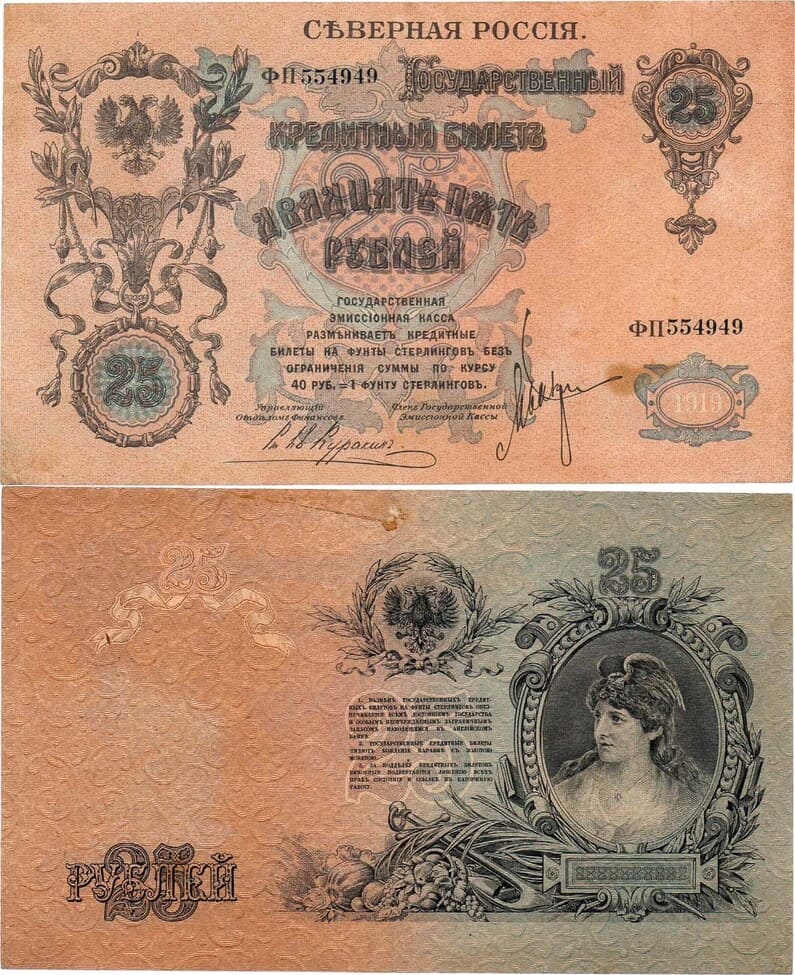Серия ФП №554949. Второй выпуск 1919 года. Банкноты отпечатаны в Англии. В декабре 1919 года началось их изъятие по гарантированному курсу, которое завершилось 1 февраля 1920 года. Поэтому на руках у населения их оставалось небольшое количество, причем номиналы 100 и 500 рублей встречаются редко. AU-.