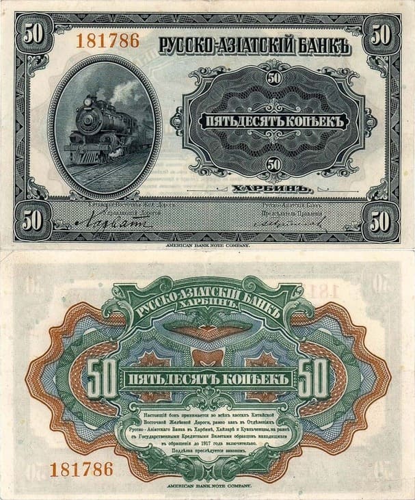 №181786. Подписи должностных лиц на денежном знаке: Китайская Восточная Жел. Дорога. Управляющий Дорогой Д.Л.Хорват, Русско-Азиатский Банк. Председатель Правления А.И. Путилов. Все подписи печатные. Кардаков XII.6.7. Истомин 400.1.1. aUNC.