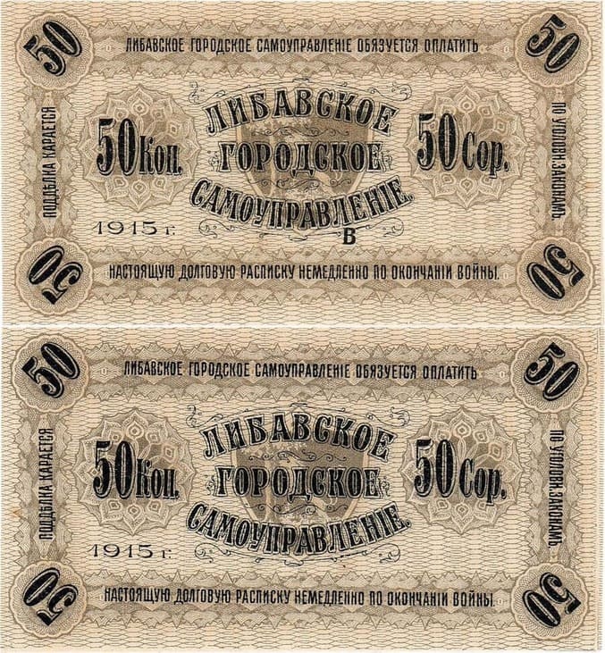 Российская Империя. Либава (Лиепая), Курляндской губернии. Либавское Городское самоуправление. Долговая расписка. 50 копеек 1915 года. Серия В. Не выпущена.