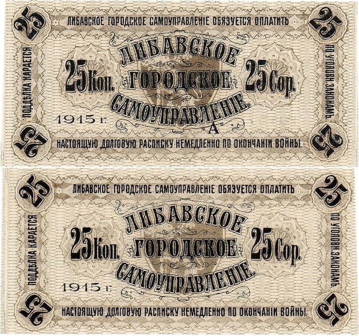 Российская Империя. Либава (Лиепая), Курляндской губернии. Либавское Городское самоуправление. Долговая расписка. 25 копеек 1915 года. Серия А. Не выпущена.