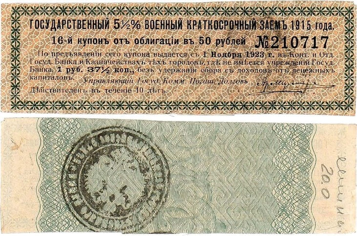 В связи с острой нехваткой наличных денежных знаков в стране, Постановлением Народного Комиссариата по финансовым делам №509 от 30 мая 1918 года в обращение введены в качестве денежных знаков облигации "Займа Свободы" достоинством не выше 100 рублей и купоны государственных процентных бумаг (государственные ренты, внутренние и военные заемы, Займа Свободы) всех достоинств (закладных листов Дворянского и Крестьянского банков), сроком погашения по 1 декабря 1917 года. Они использовались без всяких надпечаток и печатей. Позднее в 1918-1919 годах облигации займа Свободы, краткосрочные обязательства и купоны (более поздних сроков погашения, чем указано в постановлении) к ним и другим государственным процентным бумагам широко использовались с наложением штампов, надпечаток, надписей по всей территории бывшей Российской Империи. Выпуск осуществлялся от имени местных Казначейств, Отделений Государственного или Народного банков.