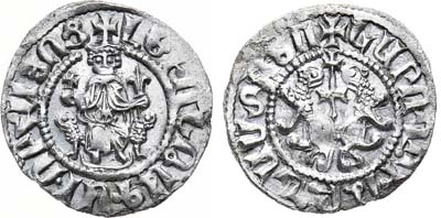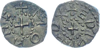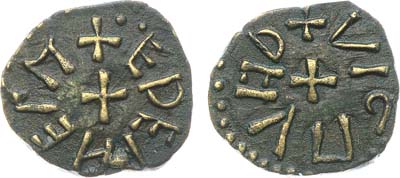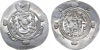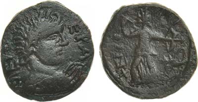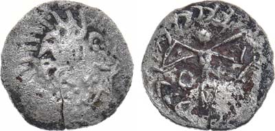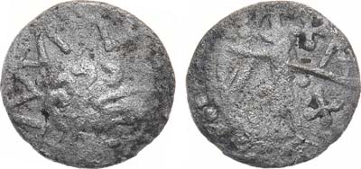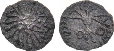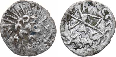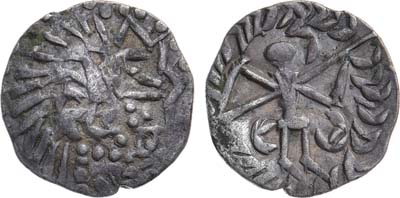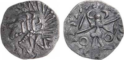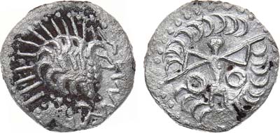 Биллон. 2,06г. Аверс: схематичное изображение головы в виде розетки, сверху и слева линии, справа два зигзага и точка. Реверс: фигура воина, ноги прямые вправо, по сторонам в поле полумесяцы, возле головы два полумесяцы в виде "рогов". VF/XF.