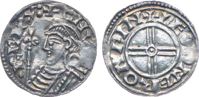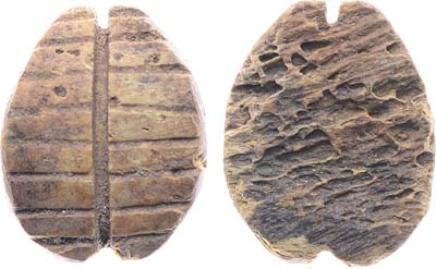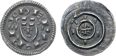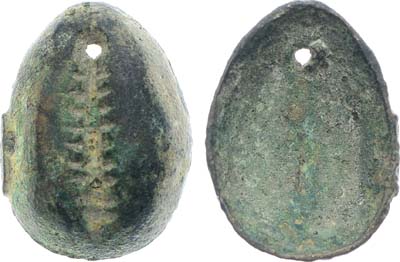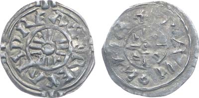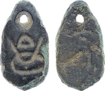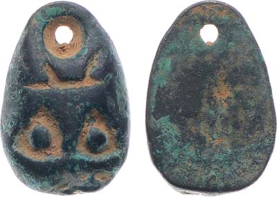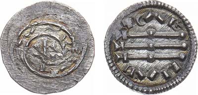 Серебро. 2,25г. Аверс: схематичное изображение головы вправо, моделированное полумесяцами, щека - три вертикальные линии, нос - острый угол; борода и окантовка шеи из точек, перед бородой зигзаги, сверху и слева линии с точками. Реверс: фигура воина с копьём, голова с точками глаз и рта; в поле два круга, по окружности полумесяцы. Клещинов подобна 141. AU.
