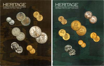 17-18 и 21-22 сентября 2015 года. Иностранные и античные монеты. Очный аукцион, лоты 29001-30716. Лонг-Бич. Хорошая подборка античных монет, много золотых монет мира, представлена коллекция очень редких 50-и центовые монеты США. Русская часть составила 117 лотами. Иностранные и античные монеты. Интернет аукцион, лоты 32001-34713. Даллас.