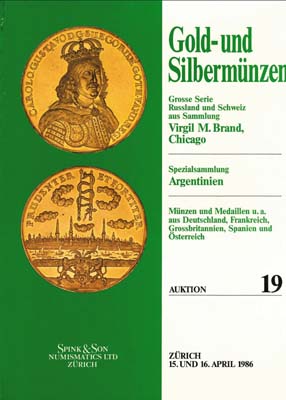 Цюрих, 15-16 апреля 1986 года. 104 стр. 1045 лотов. В том числе 269 лотов русских монет. Включает в себя великолепную подборку русских монет из коллекции известного нумизмата Вирджила М. Бранда. Исключительно важная распродажа с большим количеством редких, пробных и новодельных монет.