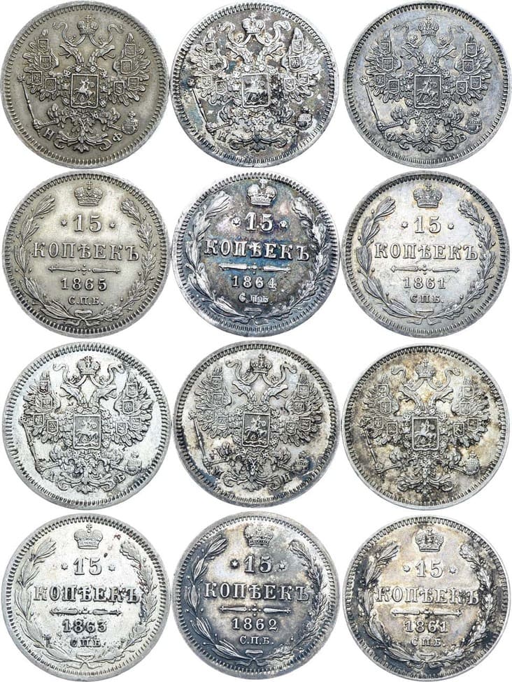 Серебро. 15 копеек 1861 года. СПБ. Биткин 290. AU. 15 копеек 1861 года. СПБ-ФБ. Биткин 185. UNC. 15 копеек 1862 года. СПБ-МИ. Биткин 187. UNC. 15 копеек 1863 года. СПБ-АБ. Биткин 188. AU. 15 копеек 1864 года. СПБ-НФ. Биткин 189. XF. 15 копеек 1865 года. СПБ-НФ. Биткин 190. UNC.