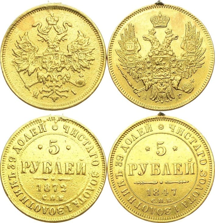 Золото. 5 рублей 1872 года. СПБ-НI. 6,42 г. Уздеников 0260(•). Биткин 20. Следы удаления подвеса. 5 рублей 1847 года. СПБ-АГ. 6,5 г. Уздеников 0228(•). Биткин 29. Следы удаления повеса.