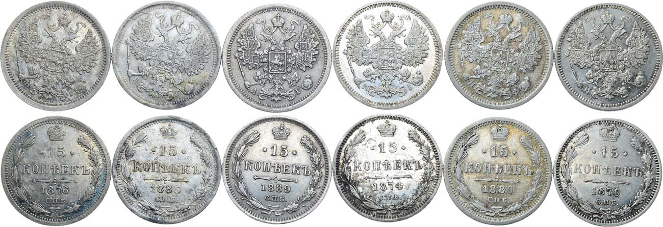 Серебро. 15 копеек 1870 года. СПБ-НI. Серебро. 2,65 г. Уздеников 1873. Биткин 238. XF/AU. 15 копеек 1874 года. СПБ-HI. Серебро. 2,55 г. Уздеников 1901. Биткин 242. XF/AU. 15 копеек 1876 года. СПБ-HI. Серебро. 2,33 г. Уздеников 1916. Биткин 244. Патина. AU. 15 копеек 1880 года. СПБ-НФ. Серебро. 2,72 г. Уздеников 1955. Биткин 249. Патина. AU. 15 копеек 1885 года. СПБ-АГ. Серебро. 2,26 г. Уздеников 1999. Биткин 118. VF/XF. 15 копеек 1889 года. СПБ-АГ. Серебро. 2,43 г. Уздеников 2031. Биткин 122. XF/AU.