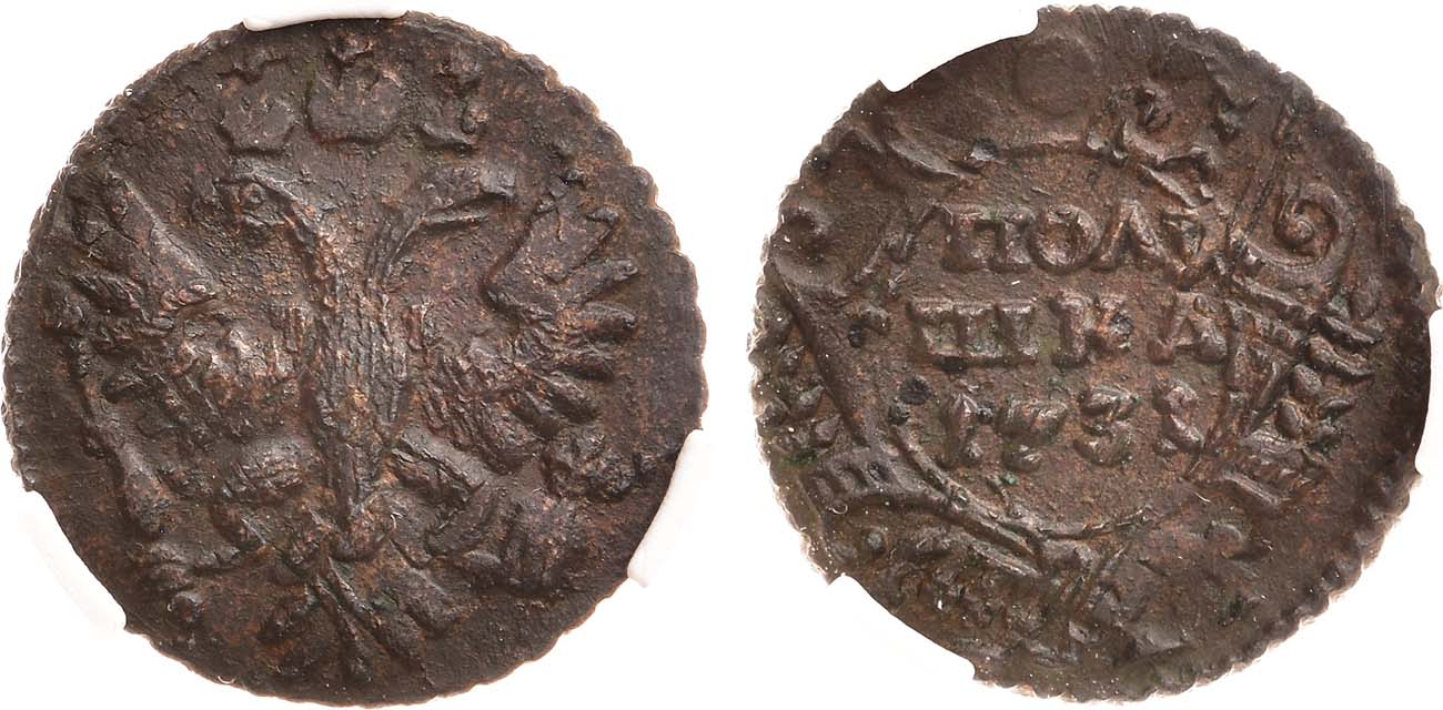Медь. Красный монетный двор. Аверс: крест державы украшенный. Реверс: розетка малая, лавровая ветвь из 9 листьев. Гурт шнуровидный. Уздеников 2487. Биткин 304. Дьяков 36, 2. Brekke 77, 4. AU 55.