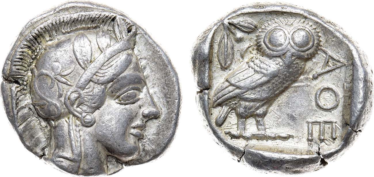 Серебро. 17,18г. Афины. Аверс: голова Афины классического стиля в аттическом шлеме вправо. Шлем украшен оливковыми листьями, в ухе богини серьга. Реверс: "АʘЕ", сова вправо, слева от нее оливковая ветвь и полумесяц. AU.