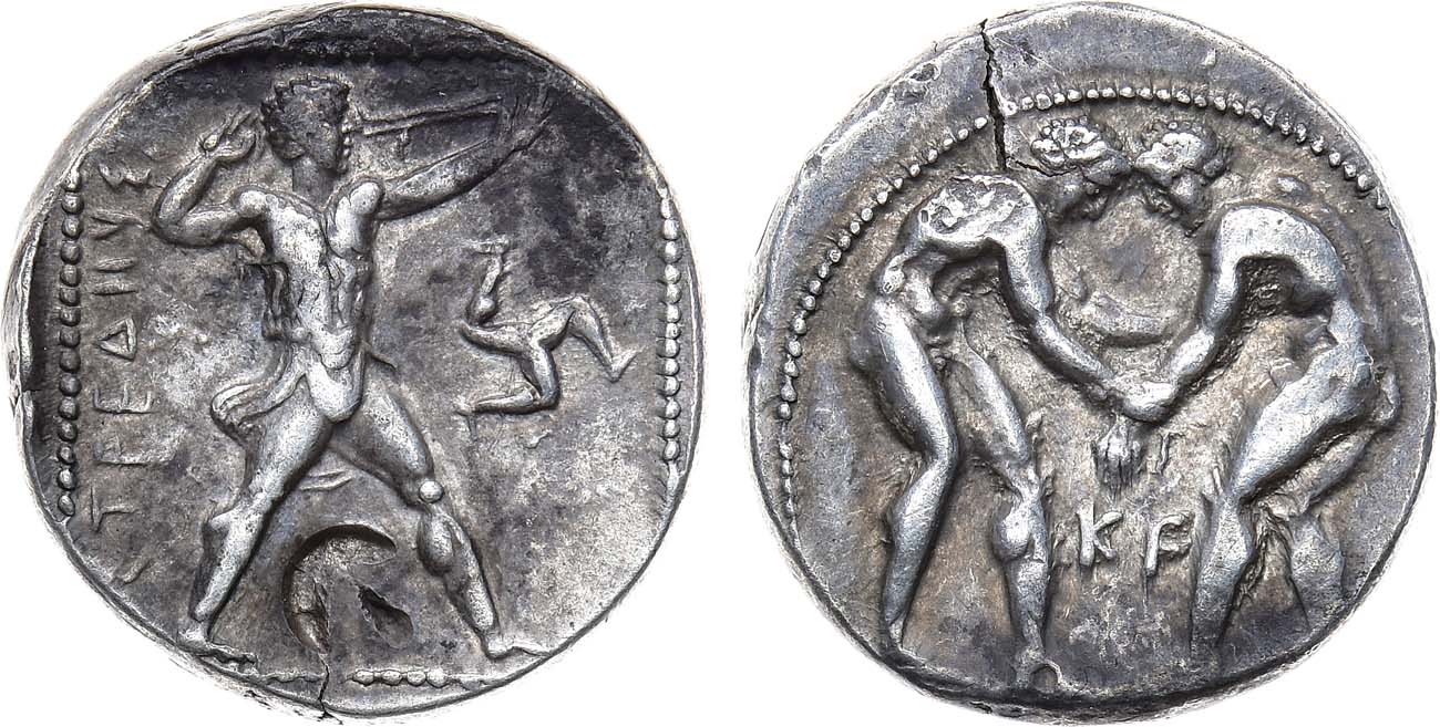Серебро. 10,83г. Аверс: два борца лицом к лицу в начале поединка. Реверс: "EΣTFEΔIIYΣ"; фигура вправо; на поле справа трискелион. AU.