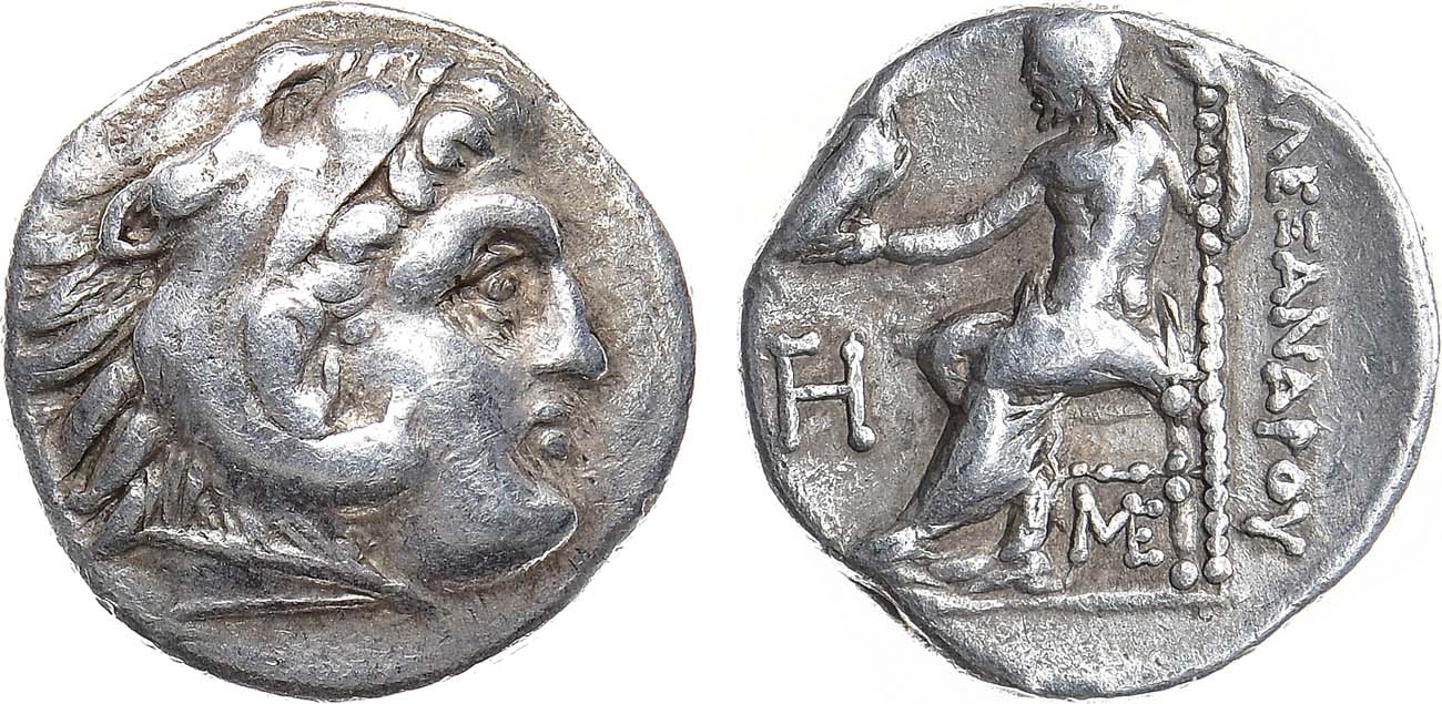 Серебро. 4,19г. Аверс: Геркулес в львиной шкуре. Реверс: Зевс сидит на троне влево, держит орла и скипетр, в поле монограмма "H"; легенда "AΛΕΞANΔPOY". VF.