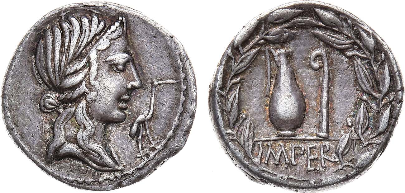 Серебро. 3,76г. Военный монетный двор в Северной Италии. Аверс: бюст Пиетас в диадеме вправо, рядом изображение аиста. Реверс: кувшин и литуус внутри лаврового венка; легенда "IMPER". AU.