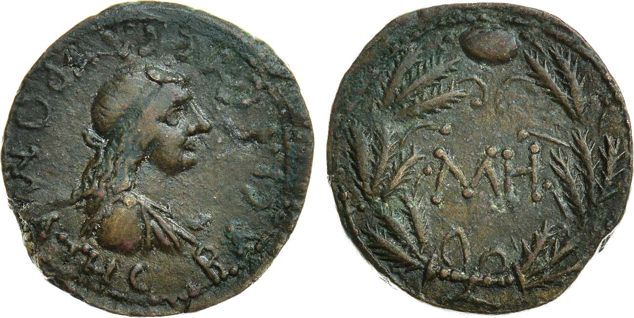Медь. 15,13г. Пантикапей. Аверс: "ΒΑCΙΛΕωC CΑΥΡΟΜΑΤΟΥ". Бюст царя вправо. Реверс: Венок, в нем "ΜΗ". Анохина В.А. (1986 г.)454. MacDonald D.398/5.. VF/XF.
