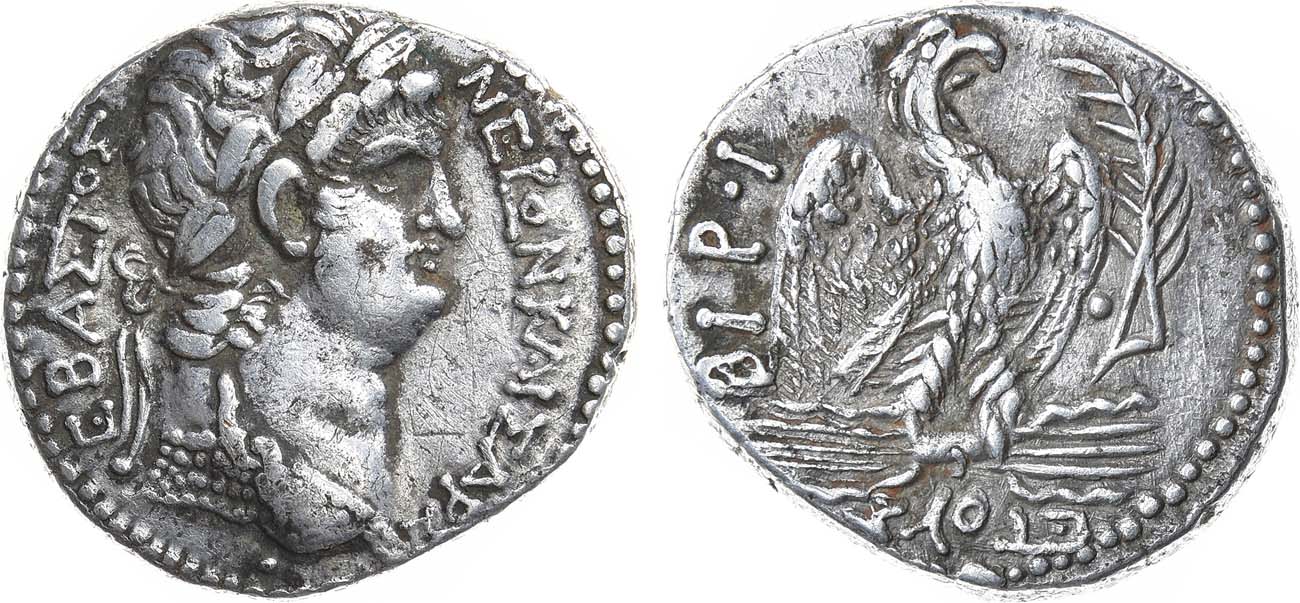 Серебро. 15,2г. Антиохия. Аверс: круговая легенда "ΝΕΡΩΝ ΚΑΙΣΑΡ ΣΕΒΑΣΤΟΣ", портрет Нерона вправо. Реверс: легенда "ETOΥΣ — BIP•I", изображение орла с распростертыми крыльями - вправо; справа пальмовая ветвь. McAlee 265a. Prieur 89. RPC I 4188.. VF/XF.