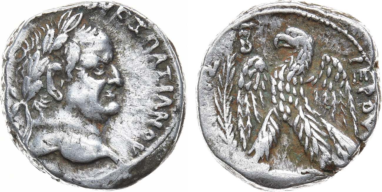 Серебро. 15,34г. Антиохия. Аверс: круговая легенда "ΑΥΤΟΚPΑTKAIΣA OYE ΣΠΑΣΙΑΝΟΥ"; портрет императора в лавровом венке вправо. Реверс: круговая легенда "ETOYΣ IEPOY"; изображение орла влево, слева в поле монограмма "В" и пальмовая ветвь. VF/XF.