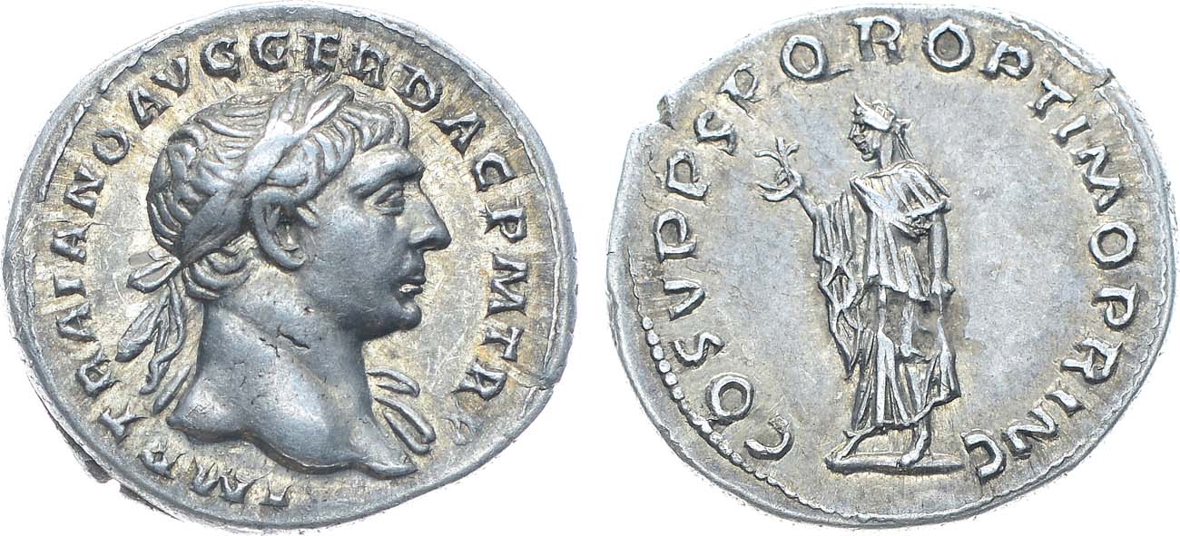 Серебро. 3,48г. Рим. "IMP TRAIANO AVG GER DAC P M TR P" драпированный бюст императора вправо. Реверс: "COS V P P S P Q R OPTIMO PRINC". RIC II 127 var (Büste), RSC II 84, MIR 266b.. XF+/AU.