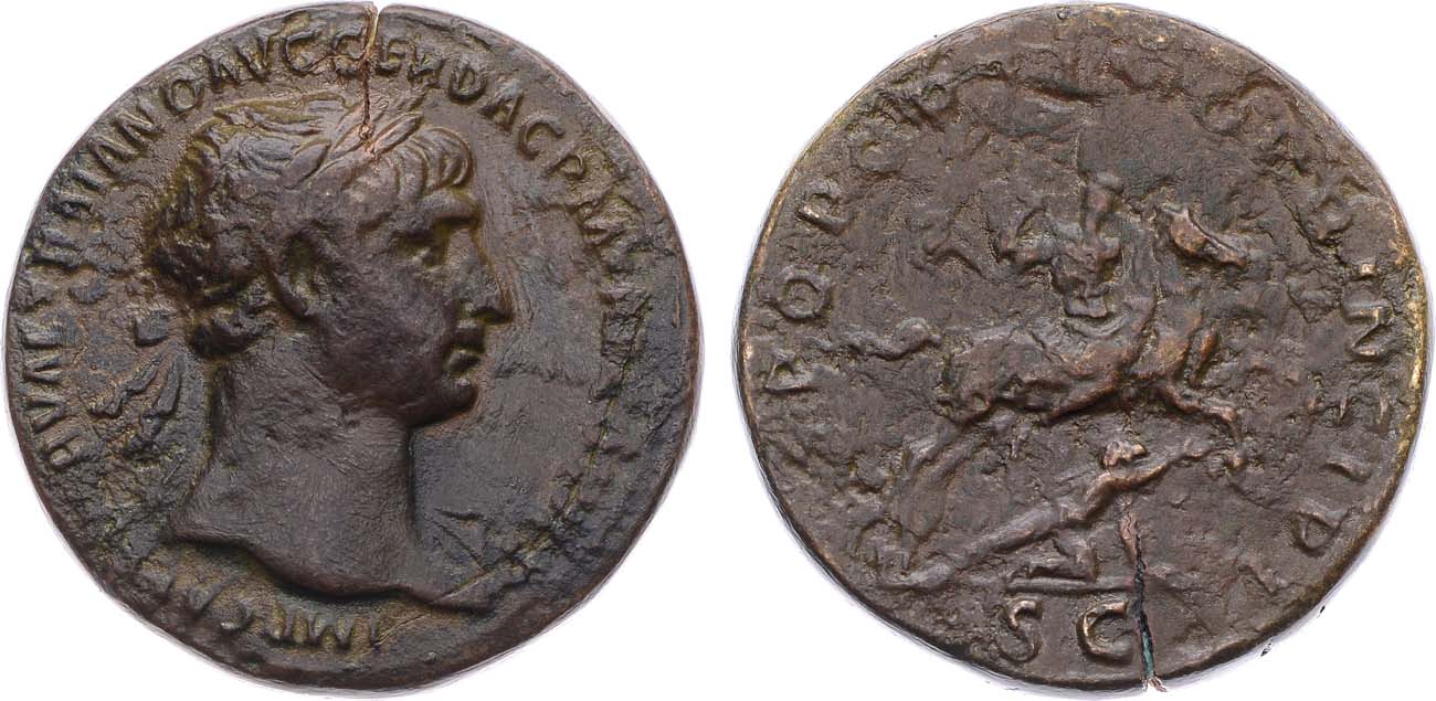 Бронза. 22,42г. Рим. Аверс: бюст императора в лавровом венке вправо. Реверс: Траян верхом пронзает копьём дакийского воина, под линией обреза "SC". Sear 3204. VF.