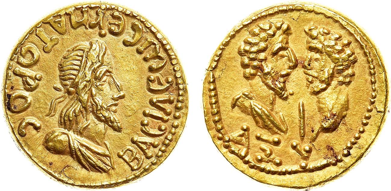 Электр. 7,79г. Пантикапей. Аверс: "ΒΑCΙΛΕωC ΕΥΠΑΤΟΡΟC". Бюст царя вправо. Реверс: Бюсты Марка Аврелия и Луция Вера, год ΘΝΥ (459 г. б. э.), копьё или меч. Анохина В.А. (1986 г.) 538(б,в). Анохина В.А. (2011 г.)1725 и 1726. Фроловой Н.А.I, LХVII, 19-23, LХVIII, 7-12. MacDonald D.469/3,4. Анохина В.А. (1986 г.) 538б. UNC.
