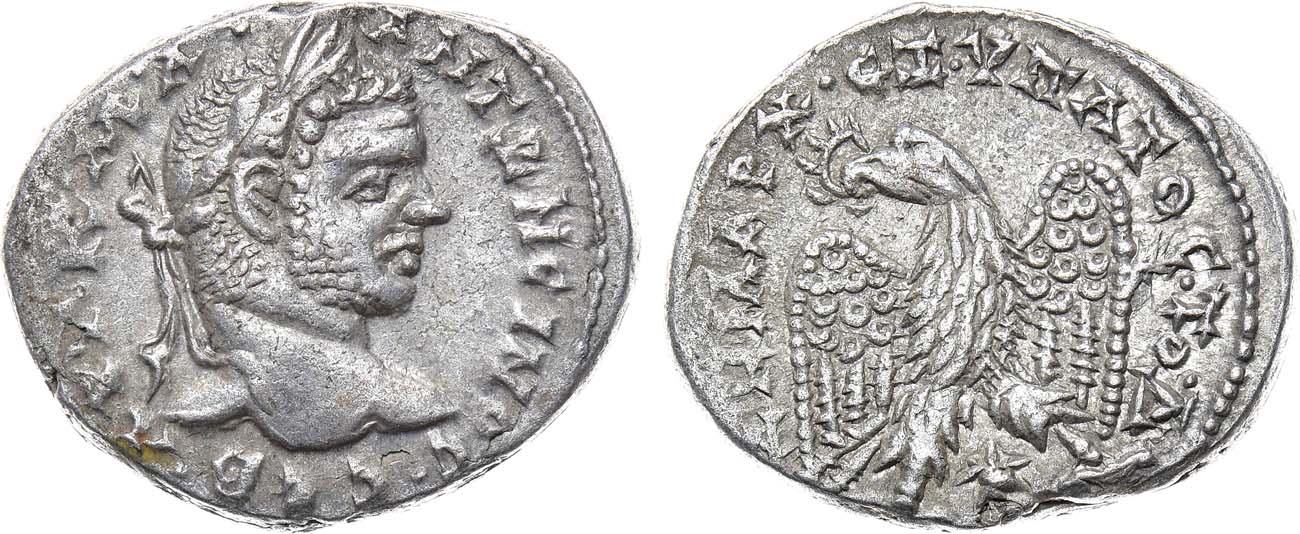 Биллон. 12,24г. Лаодикея. Аверс: бюст императора в лавровом венке вправо; легенда "AYT K M A ANTΩNEINOC CEB". Реверс: орёл с расправленными крыльями, с венком в клюве и звездой под ним; легенда "ΔHMAPX EΞ YΠATOC TO Δ". XF/AU.