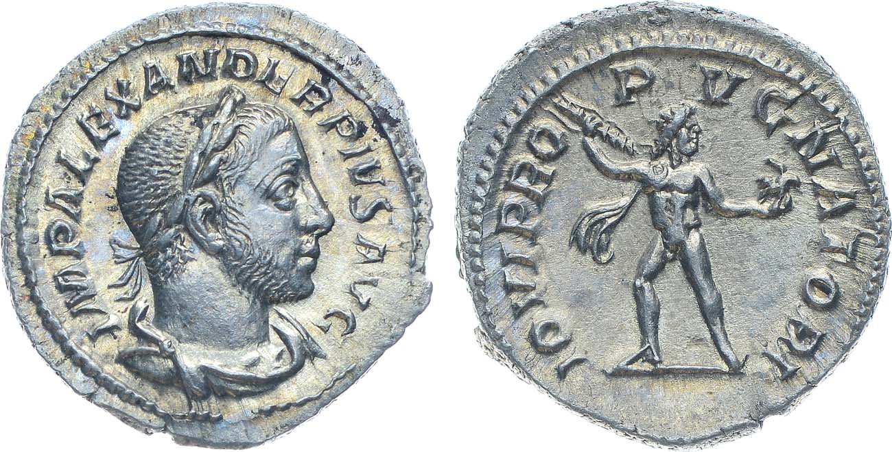 Серебро. 2,95г. Рим. Аверс: круговая легенда "IMP ALEXANDER PIVS AVG". Реверс: круговая легенда "IOVI PROPVGNATORI"; изображение Юпитера с копьём в правой руке и орлом на вытянутой левой руке - влево. Sear 7871. AU/UNC.