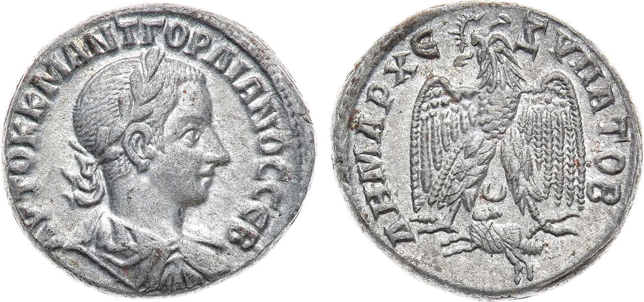 Биллон. 12,98г. Антиохия. Аверс: драпированный бюст императора в лавровом венке вправо; легенда "AYTOK K M ANT ΓOPΔIANOC CEB". Реверс: орёл анфас с расправленными крыльями, держит венок в клюве, под ним прыгающий влево баран с полумесяцем над головой; легенда "ΔHMAPX ЄΣΥΠΑΤΟΒ". AU.
