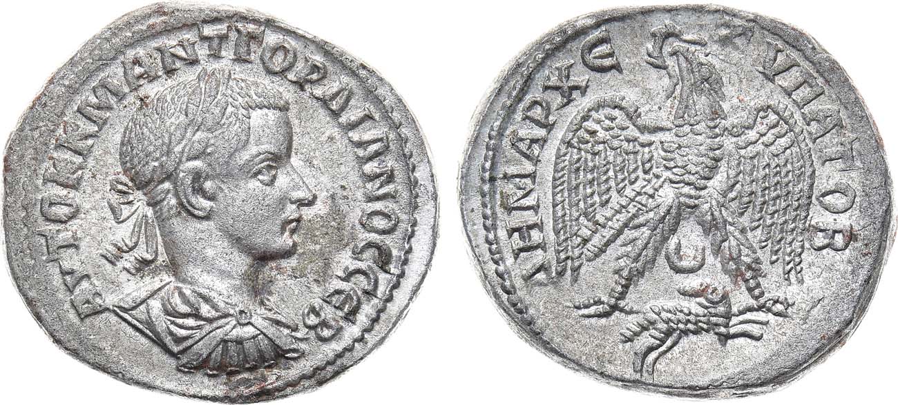 Биллон. 12,51г. Антиохия. Аверс: драпированный бюст императора в лавровом венке вправо; легенда "AYTOK K M ANT ΓOPΔIANOC CEB". Реверс: орёл анфас с расправленными крыльями, держит венок в клюве, под ним прыгающий вправо баран с полумесяцем над головой; легенда "ΔHMAPX ЄΣΥΠΑΤΟΒ". AU.