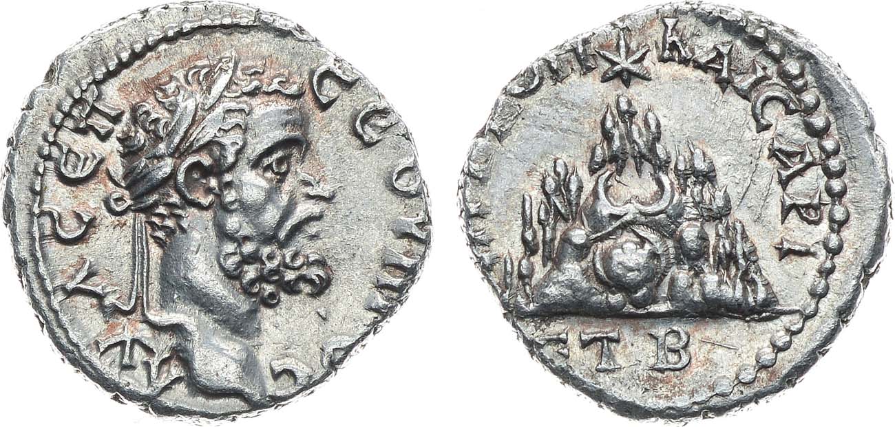 Серебро. 2,96г. Аверс: круговая легенда "ΑΥ Λ CЄΠ CЄΟΥΗΡΟC"; портрет императора в лавровом венке вправо. Реверс: круговая легенда "ΜΗΤΡΟΠΟ ΚΑΙCAPI" изображение священной горы, внизу под линией обреза "ЄTB". Sydenham-402 var. AU.